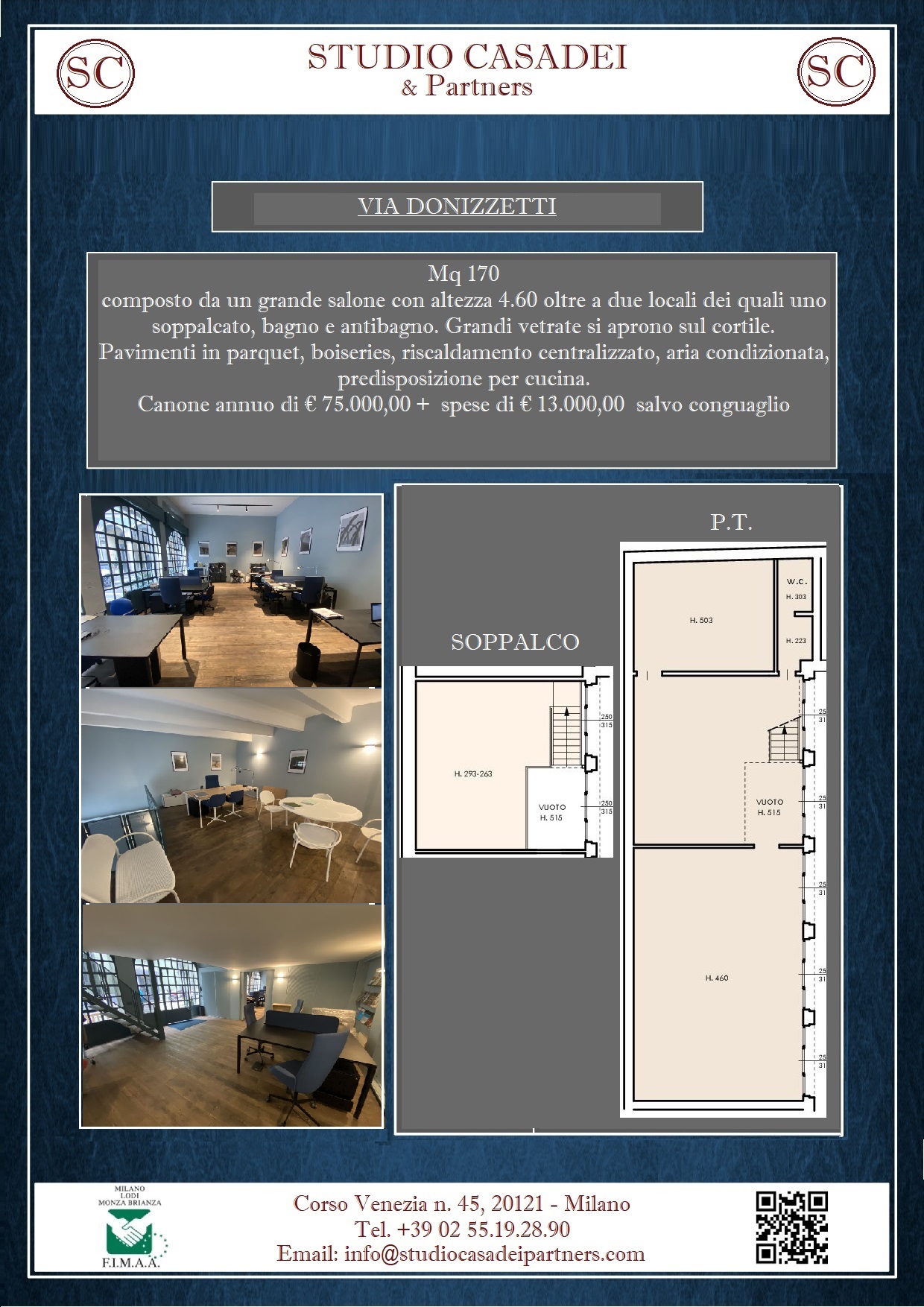 Loft in affitto in Via G. Donizetti 36, un'opportunità unica per chi cerca un ufficio spazioso e luminoso nel cuore della città. Questo loft di 170 metri quadrati è composto da un grande salone, due locali (uno soppalcato), un bagno e un antibagno. L'altezza del soffitto di 4,60 metri e le grandi finestre con vista sul cortile creano un'atmosfera unica e accogliente. Il pavimento in parquet e i dettagli architettonici in boiseries conferiscono un tocco di eleganza e raffinatezza. Il loft è dotato di riscaldamento centralizzato, aria condizionata e predisposizione per la cucina.