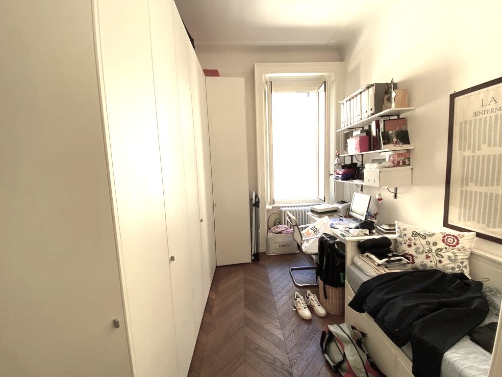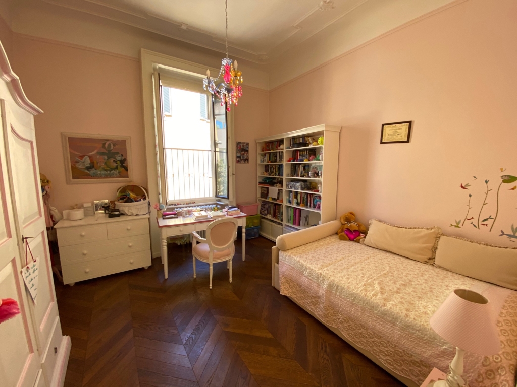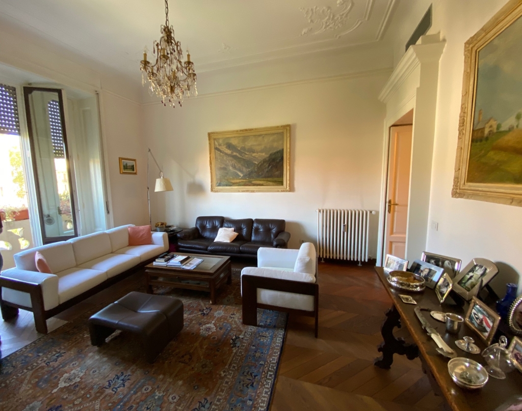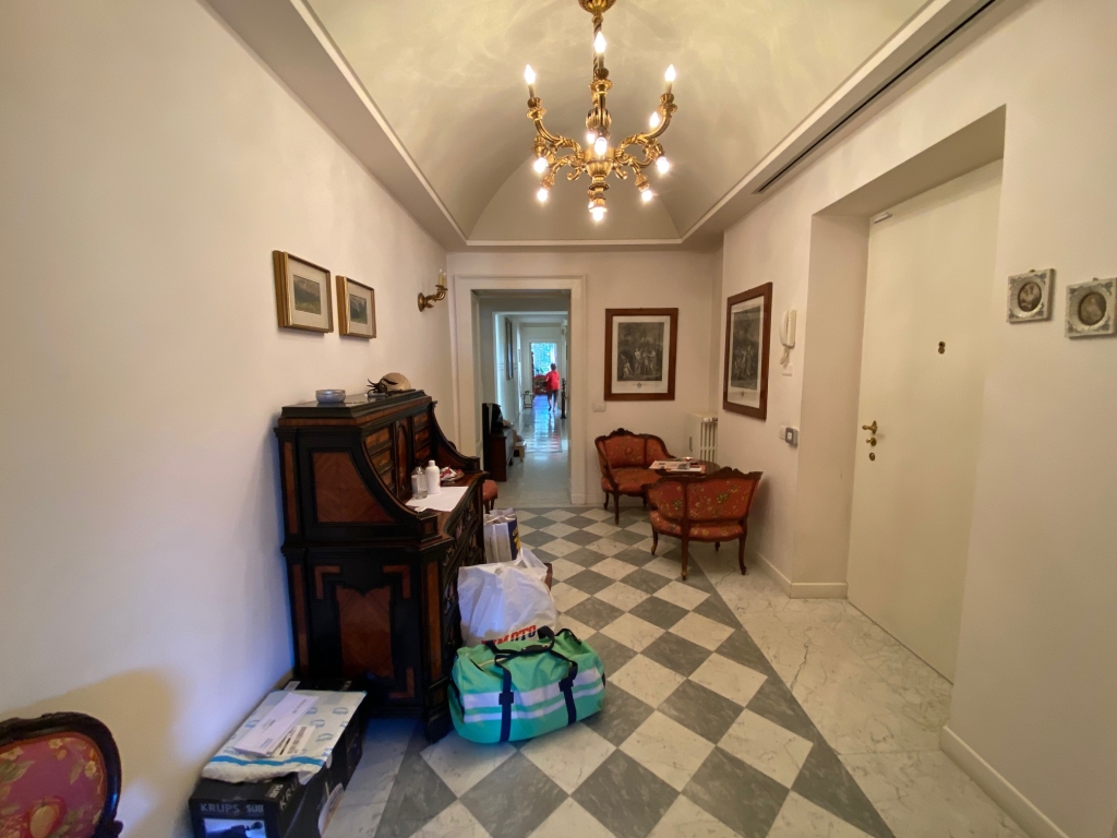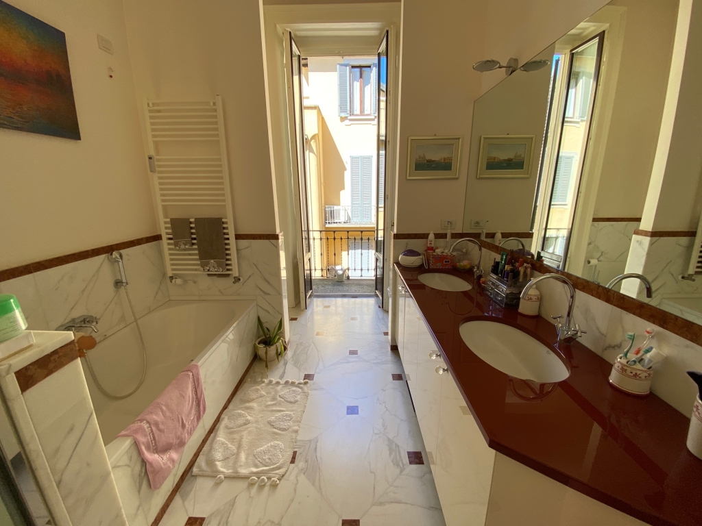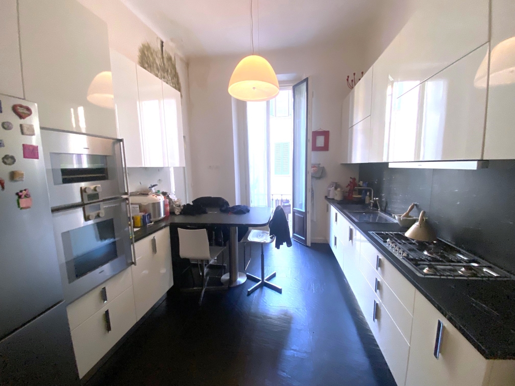 Stabile d'epoca di prestigio, appartamento composto da ingresso, soggiorno con balcone, pranzo, cucina abitabile con balcone e bagno di servizio/lavanderia, tre camere e due bagni. Completamente ristrutturato con finiture di pregio