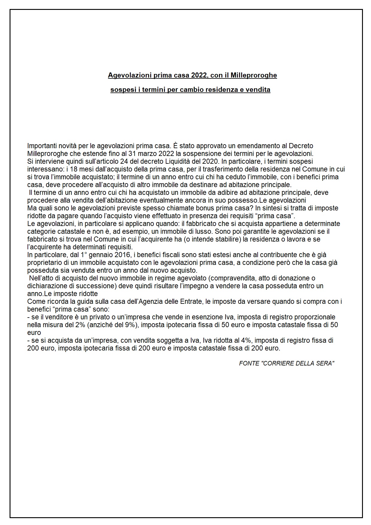 AGEVOLAZIONI PRIMA CASA 2022 - Sospensione termini residenza e vendita